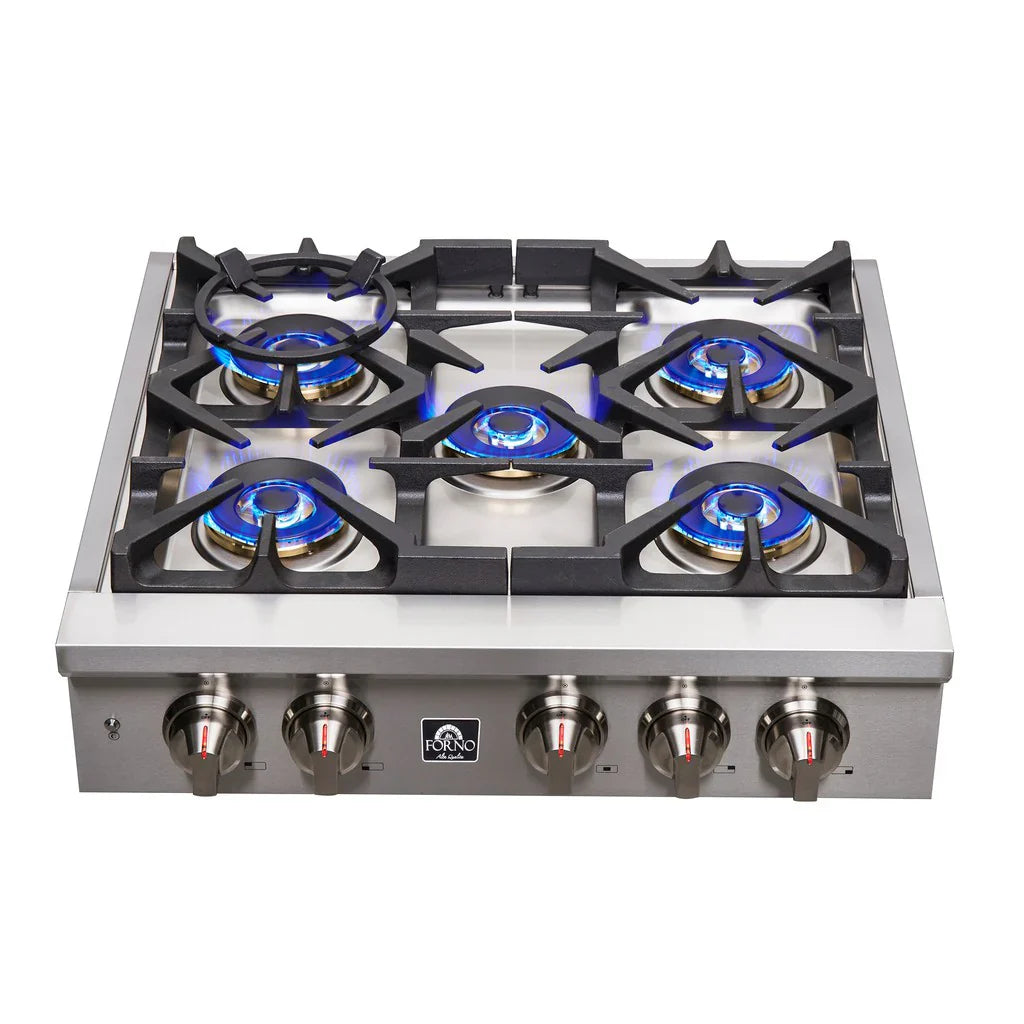 The Forno 30-inch gas rangetop features a practical cooktop layout with five sealed dual brass burners delivering a combined output of up to 100,000 BTUs. The sealed burner design supports consistent heat distribution and simplifies cleanup during everyday cooking.