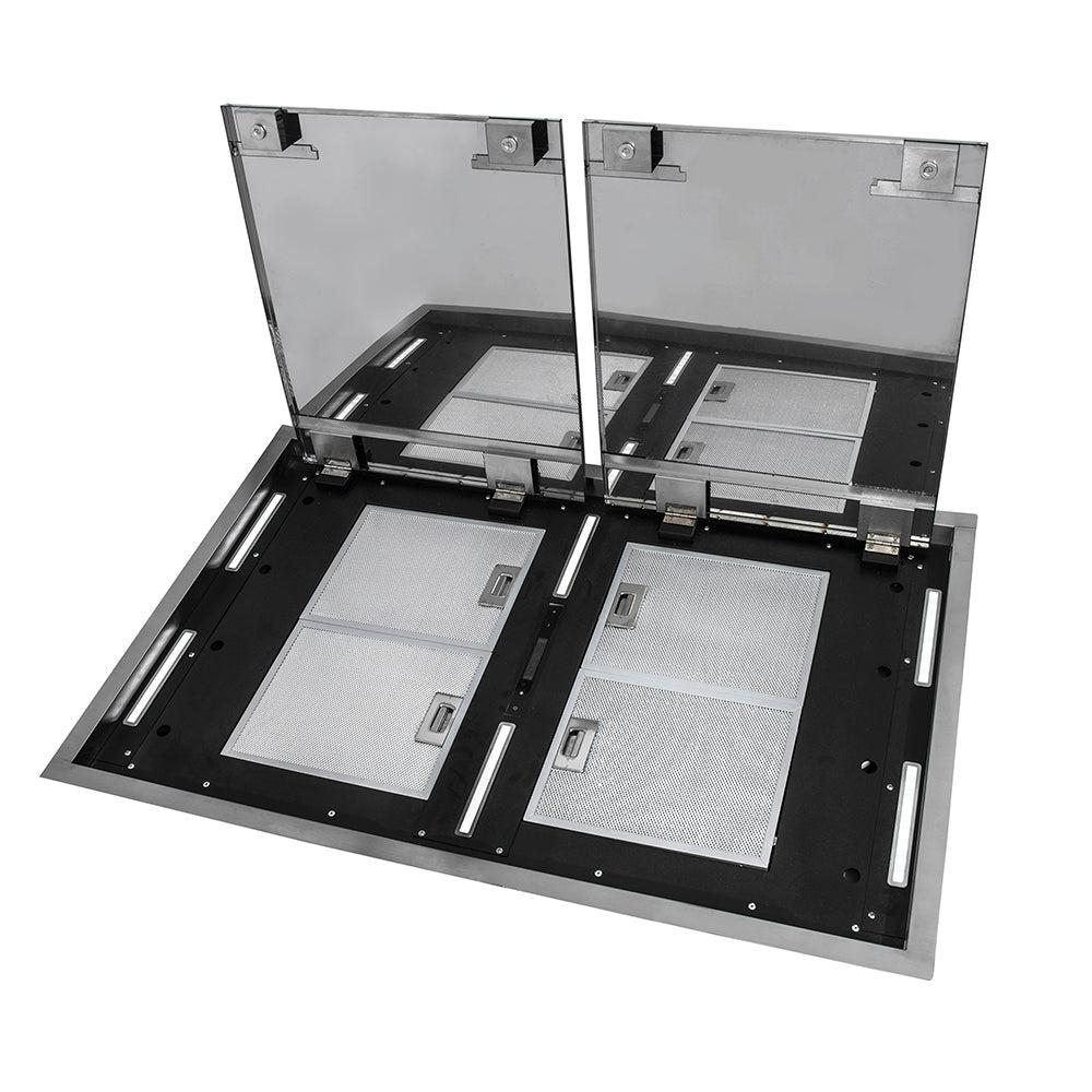 Operation is managed through electronic controls, with an included remote control for added convenience. Integrated square LED lighting provides task illumination over the cooking area.