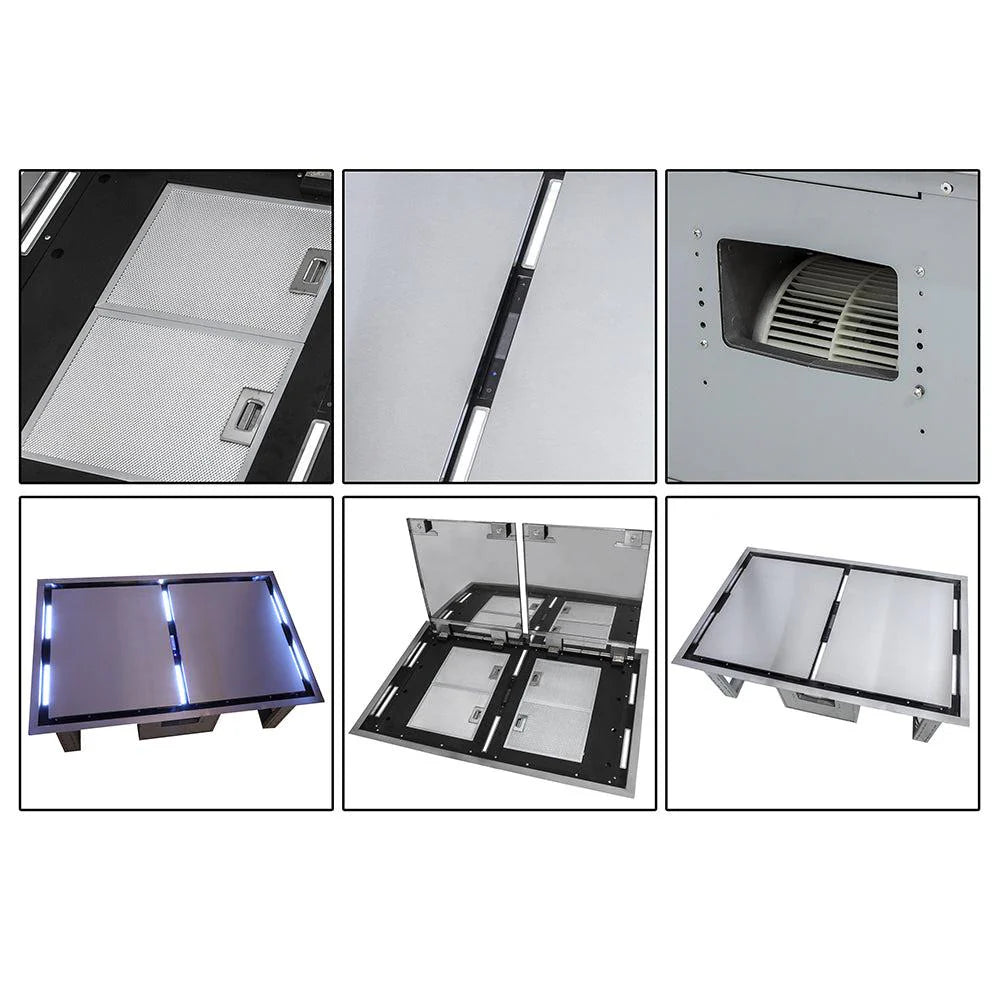 The Forno Arezzo 44-Inch Ceiling-Mounted Recessed Range Hood (Model FRHRE5312-44) is designed for built-in ceiling installation and constructed from stainless steel for durability. It features a 1200 CFM ventilation system to support effective air extraction during cooking.