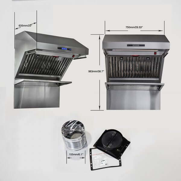 The range hood uses stainless steel hybrid mesh filters designed to capture grease and cooking odors. The filters are removable and dishwasher safe for routine cleaning. Multiple fan speed settings allow airflow adjustment based on cooking requirements.