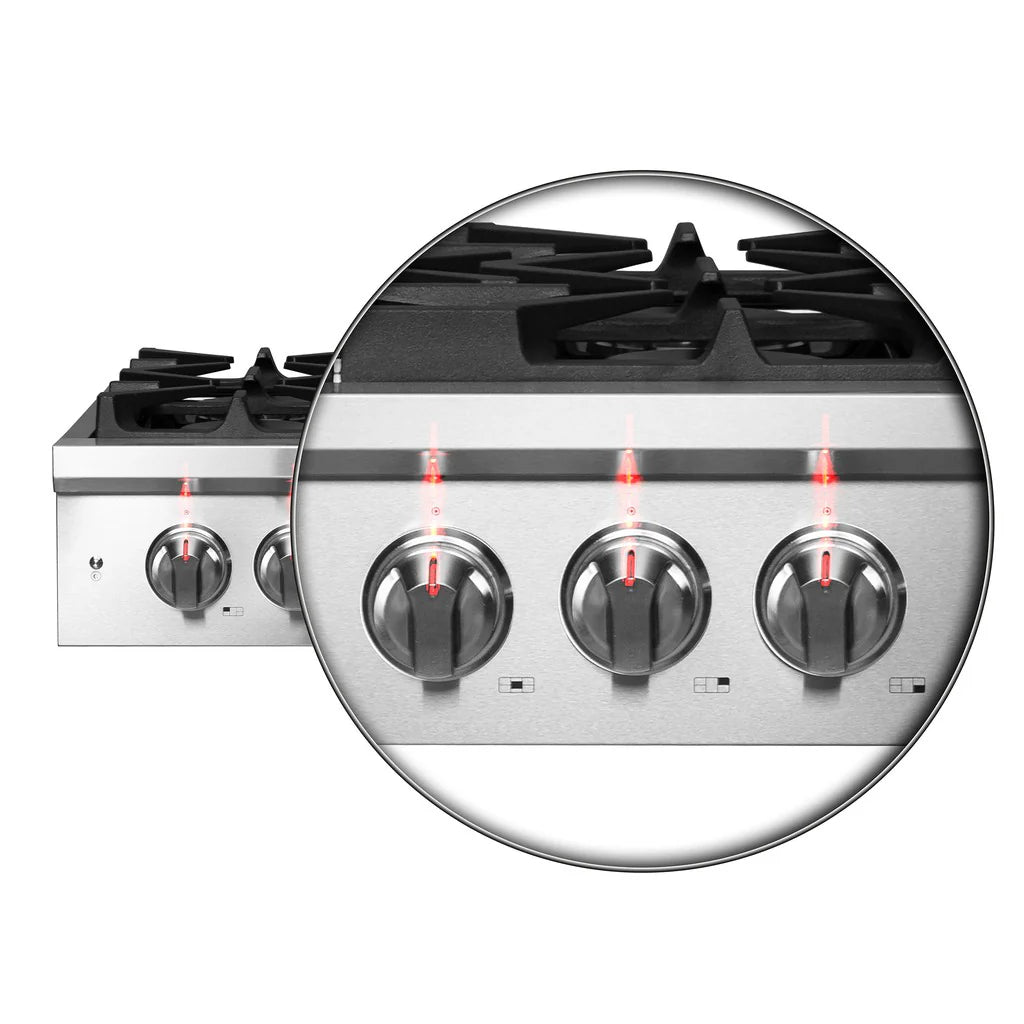 The deep recessed stainless steel cooktop surface is designed for durability and routine maintenance. The exterior is constructed from food-grade stainless steel to match other compatible kitchen appliances. An LP conversion kit is included for alternate fuel setup. LED indicator lights beneath the control panel improve visibility during operation.