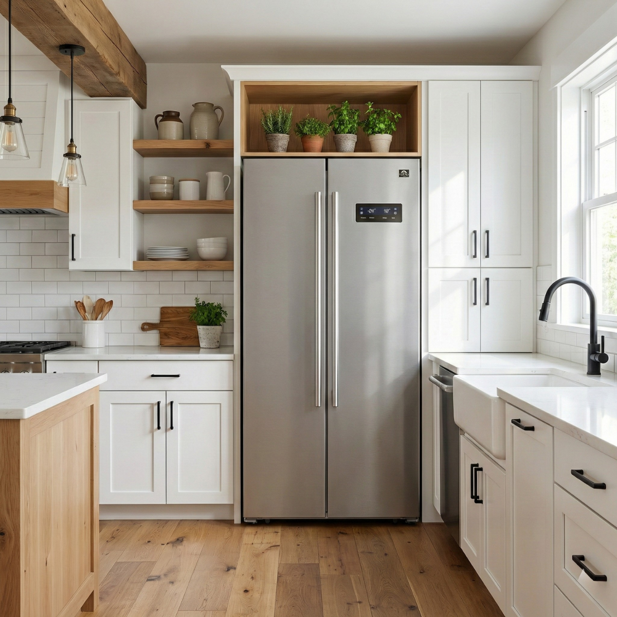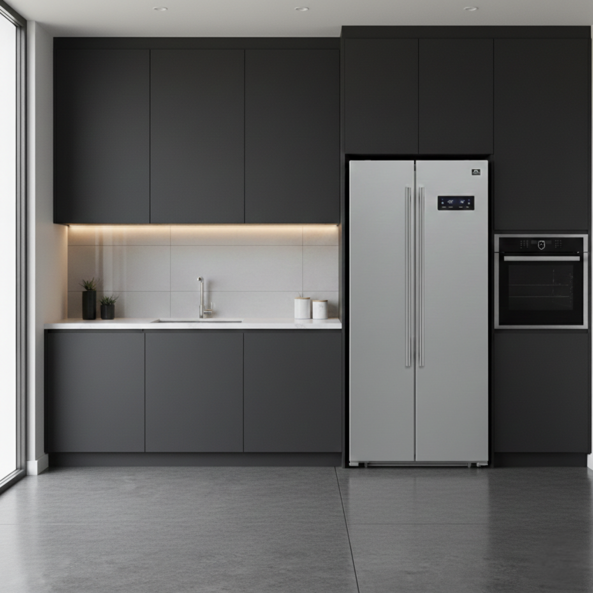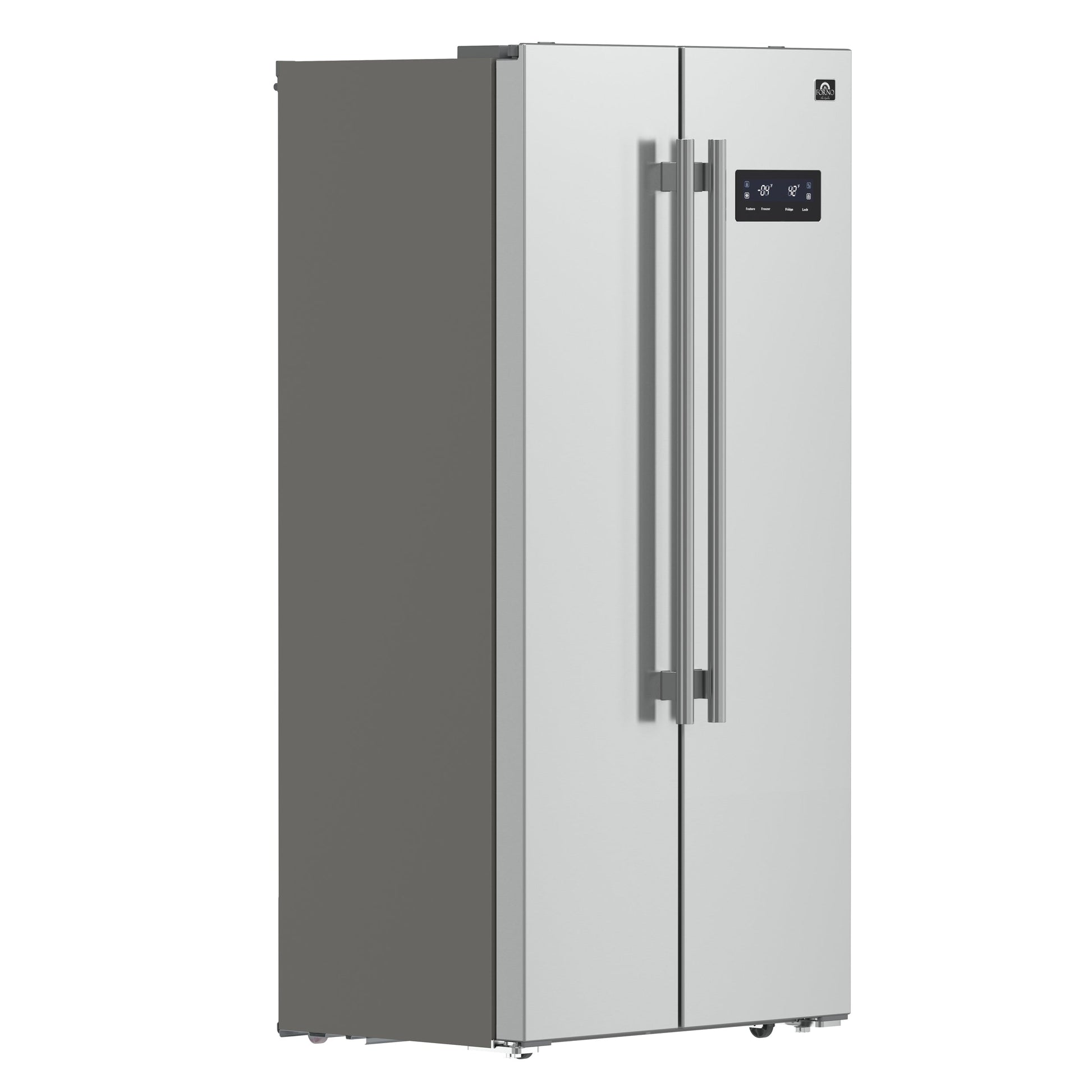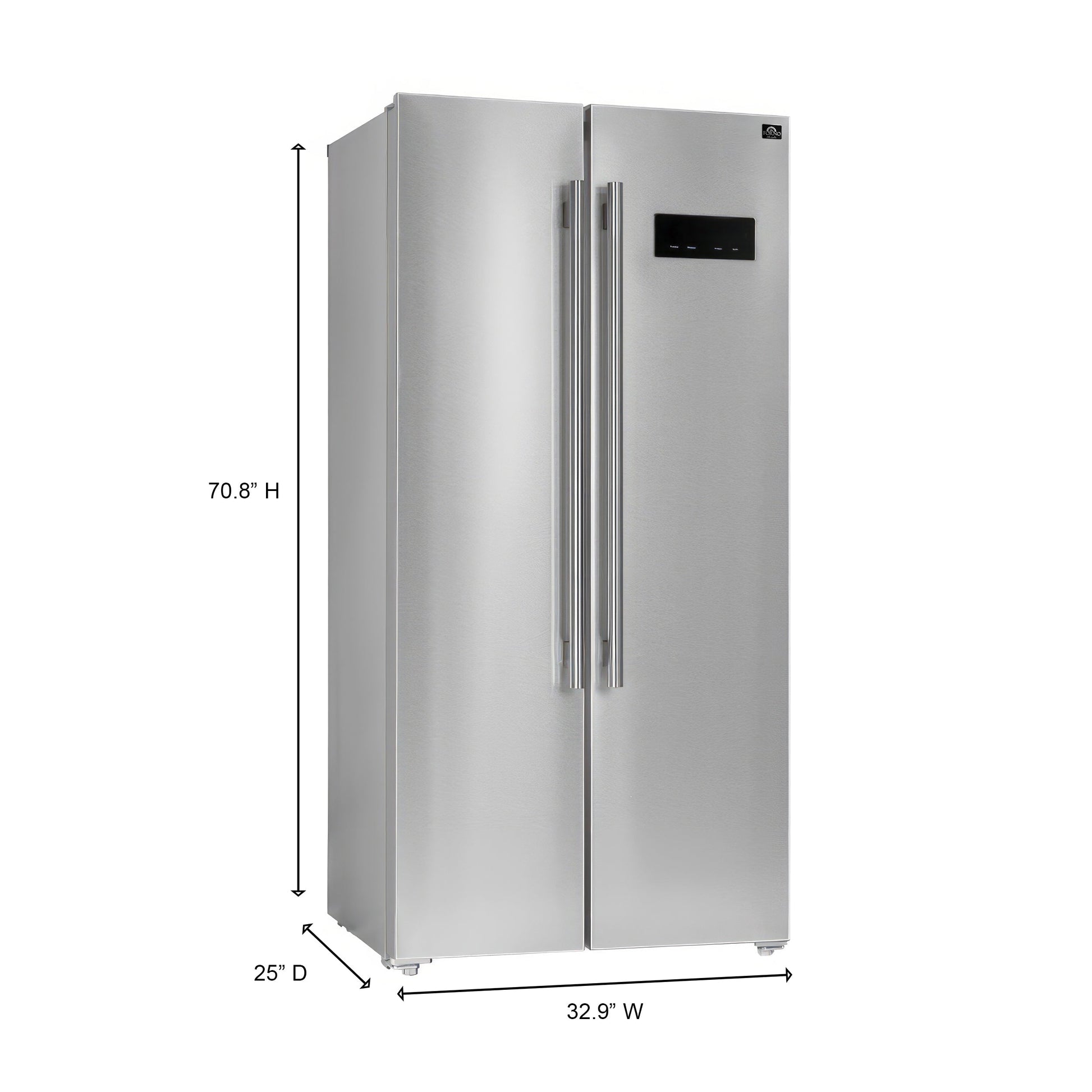 The Forno Salerno 33-inch side-by-side built-in refrigerator provides 15.6 cu. ft. of total storage capacity, including 9.54 cu. ft. of refrigerator space and 6.08 cu. ft. of freezer space. The unit features interior LED lighting, an electronic LED temperature display on the door, and a door-open alarm for monitoring and convenience. Adjustable glass shelves and door bins support organized storage, while transparent drawers allow quick visibility of stored items.