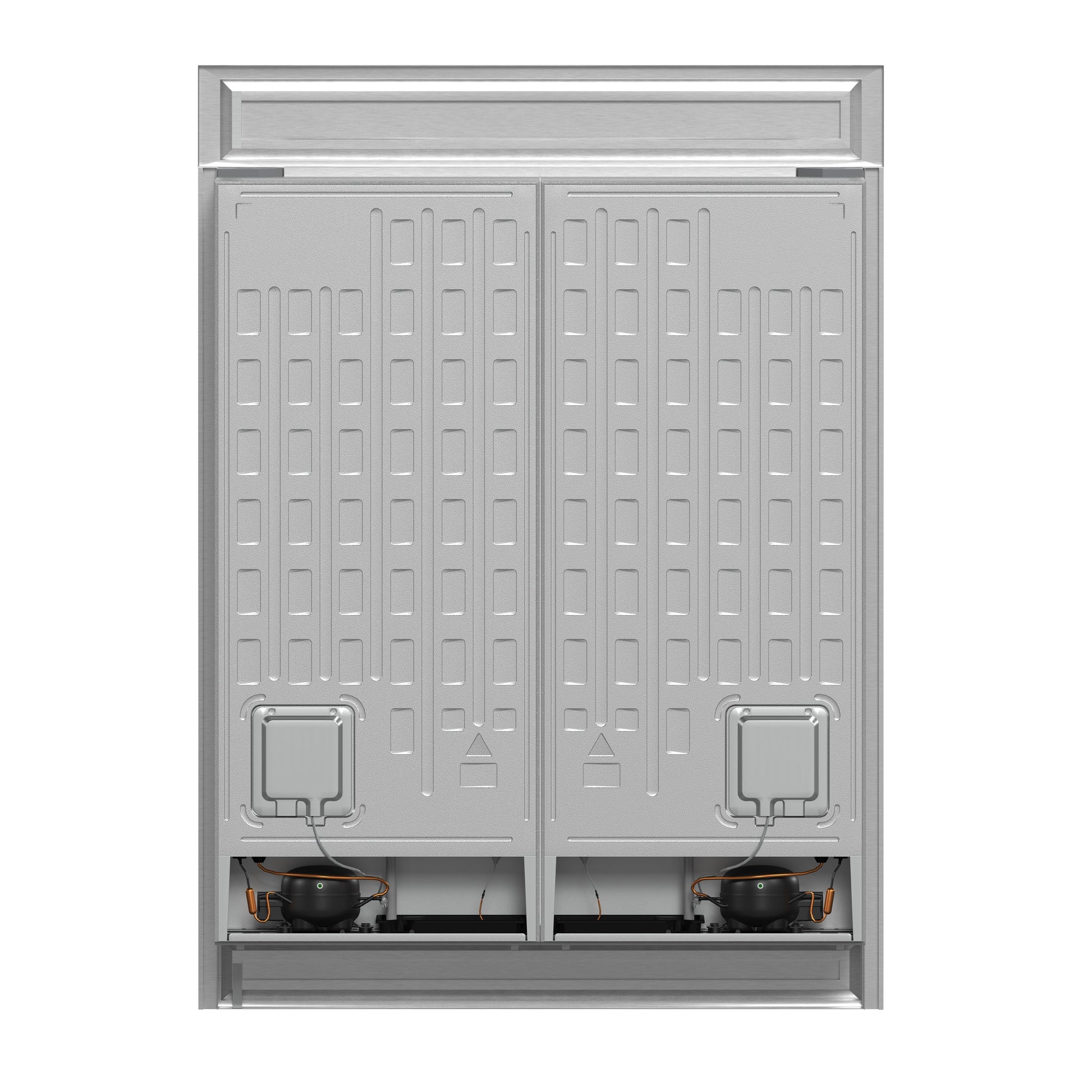 The FORNO Maderno refrigerator and freezer combination consists of two 28-inch convertible units connected with a trim kit to create a 60-inch built-in configuration. The appliance provides a total capacity of 27.2 cu. ft. and includes independently controlled compartments that can be set to refrigerator or freezer modes. A frost-free cooling system is designed to reduce ice buildup and maintain consistent internal temperatures. The unit uses dual inverter compressors and features interior LED lighting, glass shelves with trim, and removable drawers for organized storage. Super Cool and Super Freeze functions allow faster temperature adjustment when needed. The exterior is finished in stainless-steel-look VCM panels.