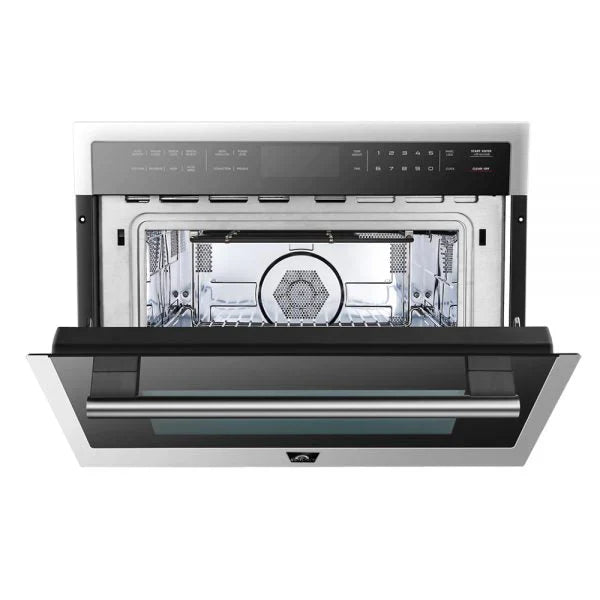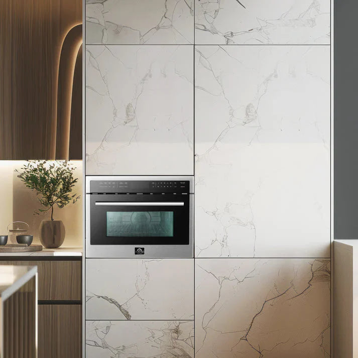 The Forno Oliena 24-inch compact microwave and convection oven is designed to provide multiple cooking functions in a single built-in appliance. It features a stainless-steel interior that supports durability and easy cleaning, along with glass touch controls and a clear LCD display for straightforward operation.