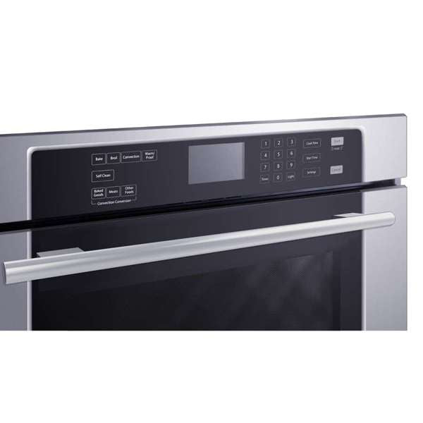 The oven includes two electroplated steel racks for flexible rack positioning. A steam clean pan is included to assist with routine cleaning, and self-clean and delay start functions offer additional convenience. The stainless steel finish is designed for built-in installation in standard 30-inch wall oven cutouts.